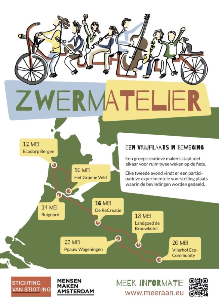 Een groep creatieve makers stapt op 9 mei 2026 met elkaar voor ruim twee weken op de fiets. We verblijven steeds twee nachten op een inspirerende buitenplek en reizen daarna weer verder. De tocht brengt deze mensen bij elkaar om samen ons persoonlijke belevingsonderzoek te doen. Het is aldus een bewegende broedplaats. Elke tweede avond vindt er een participatieve experimentele voorstelling plaats waarin de bevindingen hiervan worden gedeeld.