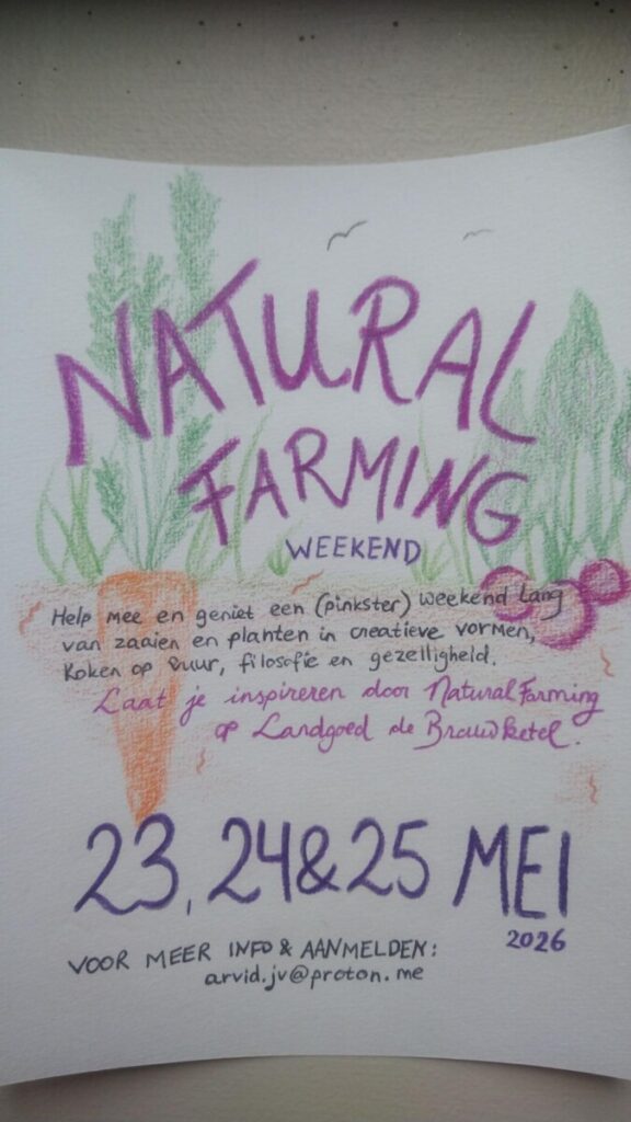 Tijdens het pinksterweekend (23/24/25 mei) nodigt Arvid jullie uit om een indruk te krijgen hoe Natural Farming er in de praktijk uit ziet; en om mee te helpen met het zaaien en planten van zomergroentes in creatieve of praktische patronen op een Natural Farming-moestuin.